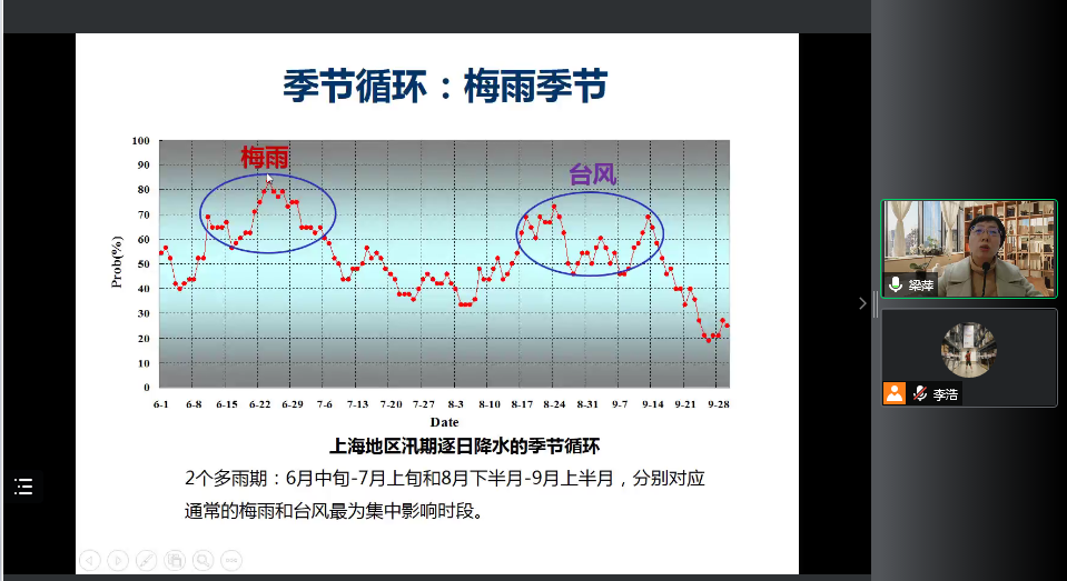 梁萍首先对上海市气象局的历史发展与主要概况作了简要的介绍。然后,从梅雨的定义、不同层面对梅雨研究与预测的需求阐述了梅雨变率及预测的至关重要性。随后,以梅雨的多尺度变率及预测问题为主线,在介绍梅雨气候特征的基础上,揭示其次季节至季节变率和长期变化事实。同时,结合大量的典型梅雨实例、数据和图片,对梅雨的次季节-季节预测进行了分析讲解。最后,梁萍与同学们进行了线上交流互动。
