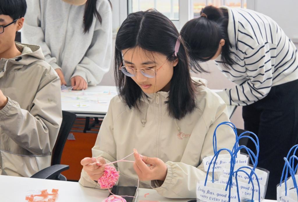 活动伊始,工作人员向到场同学详细介绍活动宗旨、流程安排与注意事项,引导大家以轻松放松的状态投入体验。首先进行的是“玩个毛线”环节,同学们以彩线为媒介,将情绪与心意相互缠绕,自由搭配色彩与造型,齐心协力搭建出一面创意十足、温暖治愈的毛线墙,在动手过程中舒缓紧绷的神经。随后,大家进入“毛线娃娃”制作环节,指尖穿梭编织,搭配可爱配饰与装饰材料,专注打造专属暖心玩偶,在慢节奏的手工创作中感受平静与愉悦,让焦虑与疲惫悄然消散。此后,“烦恼都丢掉”环节有序开展,同学们认真写下心中烦恼与压力,统一封存收纳,以仪式感告别负面情绪,并收获清新小盆栽,为日常生活注入生机与希望。