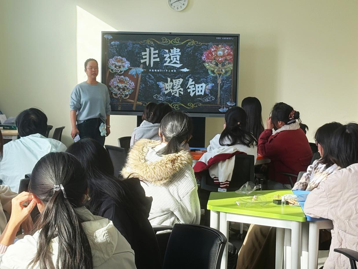 活动伊始,主持人从螺钿技艺的历史渊源、工艺特色与文化价值三方面展开系统讲解。以唐代螺钿镜为切入点,带领同学们追溯这项镶嵌技艺的千年发展脉络;随后详细介绍了螺钿在选材、打磨、镶嵌等环节的独特工艺,并通过明清螺钿家具的图片展示,让同学们直观感受“螺钿妆成翡翠光”的艺术魅力。谈及非遗的当代意义,她强调:“传统技艺不是束之高阁的老古董,而是能够融入现代生活的活态文化。”