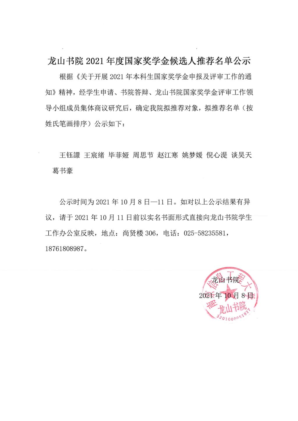 上一条:关于龙山书院2021年秋季国家励志奖学金候选学生公示
